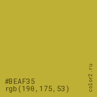 Цвет #BEAF35 в цветовой модели RGB обозначается тремя октетами (190, 175, 53) в десятичном формате и #BEAF35 в шестнадцатиричном (hex) формате, которые являются интенсивностью красного 190 (hex BE), интенсивность зелёного 175 (hex AF) и интенсивность синего 53 (hex 35).