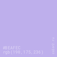 Цвет #BEAFEC в цветовой модели RGB обозначается тремя октетами (190, 175, 236) в десятичном формате и #BEAFEC в шестнадцатиричном (hex) формате, которые являются интенсивностью красного 190 (hex BE), интенсивность зелёного 175 (hex AF) и интенсивность синего 236 (hex EC).