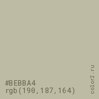 Цвет #BEBBA4 в цветовой модели RGB обозначается тремя октетами (190, 187, 164) в десятичном формате и #BEBBA4 в шестнадцатиричном (hex) формате, которые являются интенсивностью красного 190 (hex BE), интенсивность зелёного 187 (hex BB) и интенсивность синего 164 (hex A4).
