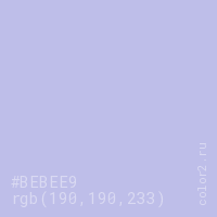 Цвет #BEBEE9 в цветовой модели RGB обозначается тремя октетами (190, 190, 233) в десятичном формате и #BEBEE9 в шестнадцатиричном (hex) формате, которые являются интенсивностью красного 190 (hex BE), интенсивность зелёного 190 (hex BE) и интенсивность синего 233 (hex E9).