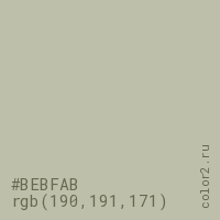 Цвет #BEBFAB в цветовой модели RGB обозначается тремя октетами (190, 191, 171) в десятичном формате и #BEBFAB в шестнадцатиричном (hex) формате, которые являются интенсивностью красного 190 (hex BE), интенсивность зелёного 191 (hex BF) и интенсивность синего 171 (hex AB).