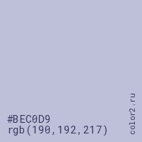 Цвет #BEC0D9 в цветовой модели RGB обозначается тремя октетами (190, 192, 217) в десятичном формате и #BEC0D9 в шестнадцатиричном (hex) формате, которые являются интенсивностью красного 190 (hex BE), интенсивность зелёного 192 (hex C0) и интенсивность синего 217 (hex D9).