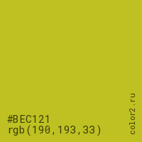 Цвет #BEC121 в цветовой модели RGB обозначается тремя октетами (190, 193, 33) в десятичном формате и #BEC121 в шестнадцатиричном (hex) формате, которые являются интенсивностью красного 190 (hex BE), интенсивность зелёного 193 (hex C1) и интенсивность синего 33 (hex 21).