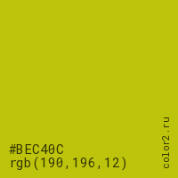 Цвет #BEC40C в цветовой модели RGB обозначается тремя октетами (190, 196, 12) в десятичном формате и #BEC40C в шестнадцатиричном (hex) формате, которые являются интенсивностью красного 190 (hex BE), интенсивность зелёного 196 (hex C4) и интенсивность синего 12 (hex 0C).