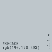Цвет #BEC6CB в цветовой модели RGB обозначается тремя октетами (190, 198, 203) в десятичном формате и #BEC6CB в шестнадцатиричном (hex) формате, которые являются интенсивностью красного 190 (hex BE), интенсивность зелёного 198 (hex C6) и интенсивность синего 203 (hex CB).
