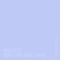 Цвет #BECAF8 в цветовой модели RGB обозначается тремя октетами (190, 202, 248) в десятичном формате и #BECAF8 в шестнадцатиричном (hex) формате, которые являются интенсивностью красного 190 (hex BE), интенсивность зелёного 202 (hex CA) и интенсивность синего 248 (hex F8).