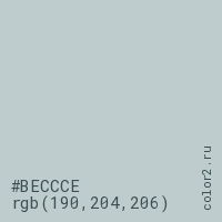 Цвет #BECCCE в цветовой модели RGB обозначается тремя октетами (190, 204, 206) в десятичном формате и #BECCCE в шестнадцатиричном (hex) формате, которые являются интенсивностью красного 190 (hex BE), интенсивность зелёного 204 (hex CC) и интенсивность синего 206 (hex CE).