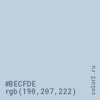 Цвет #BECFDE в цветовой модели RGB обозначается тремя октетами (190, 207, 222) в десятичном формате и #BECFDE в шестнадцатиричном (hex) формате, которые являются интенсивностью красного 190 (hex BE), интенсивность зелёного 207 (hex CF) и интенсивность синего 222 (hex DE).