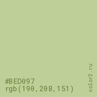 Цвет #BED097 в цветовой модели RGB обозначается тремя октетами (190, 208, 151) в десятичном формате и #BED097 в шестнадцатиричном (hex) формате, которые являются интенсивностью красного 190 (hex BE), интенсивность зелёного 208 (hex D0) и интенсивность синего 151 (hex 97).