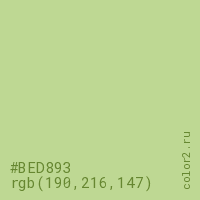 Цвет #BED893 в цветовой модели RGB обозначается тремя октетами (190, 216, 147) в десятичном формате и #BED893 в шестнадцатиричном (hex) формате, которые являются интенсивностью красного 190 (hex BE), интенсивность зелёного 216 (hex D8) и интенсивность синего 147 (hex 93).