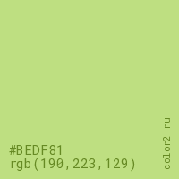 Цвет #BEDF81 в цветовой модели RGB обозначается тремя октетами (190, 223, 129) в десятичном формате и #BEDF81 в шестнадцатиричном (hex) формате, которые являются интенсивностью красного 190 (hex BE), интенсивность зелёного 223 (hex DF) и интенсивность синего 129 (hex 81).