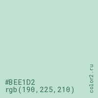 Цвет #BEE1D2 в цветовой модели RGB обозначается тремя октетами (190, 225, 210) в десятичном формате и #BEE1D2 в шестнадцатиричном (hex) формате, которые являются интенсивностью красного 190 (hex BE), интенсивность зелёного 225 (hex E1) и интенсивность синего 210 (hex D2).