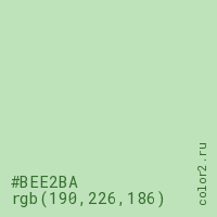 Цвет #BEE2BA в цветовой модели RGB обозначается тремя октетами (190, 226, 186) в десятичном формате и #BEE2BA в шестнадцатиричном (hex) формате, которые являются интенсивностью красного 190 (hex BE), интенсивность зелёного 226 (hex E2) и интенсивность синего 186 (hex BA).