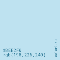 Цвет #BEE2F0 в цветовой модели RGB обозначается тремя октетами (190, 226, 240) в десятичном формате и #BEE2F0 в шестнадцатиричном (hex) формате, которые являются интенсивностью красного 190 (hex BE), интенсивность зелёного 226 (hex E2) и интенсивность синего 240 (hex F0).
