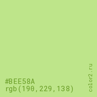 Цвет #BEE58A в цветовой модели RGB обозначается тремя октетами (190, 229, 138) в десятичном формате и #BEE58A в шестнадцатиричном (hex) формате, которые являются интенсивностью красного 190 (hex BE), интенсивность зелёного 229 (hex E5) и интенсивность синего 138 (hex 8A).