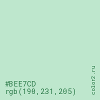Цвет #BEE7CD в цветовой модели RGB обозначается тремя октетами (190, 231, 205) в десятичном формате и #BEE7CD в шестнадцатиричном (hex) формате, которые являются интенсивностью красного 190 (hex BE), интенсивность зелёного 231 (hex E7) и интенсивность синего 205 (hex CD).
