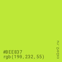 Цвет #BEE837 в цветовой модели RGB обозначается тремя октетами (190, 232, 55) в десятичном формате и #BEE837 в шестнадцатиричном (hex) формате, которые являются интенсивностью красного 190 (hex BE), интенсивность зелёного 232 (hex E8) и интенсивность синего 55 (hex 37).
