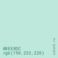Цвет #BEE8DC в цветовой модели RGB обозначается тремя октетами (190, 232, 220) в десятичном формате и #BEE8DC в шестнадцатиричном (hex) формате, которые являются интенсивностью красного 190 (hex BE), интенсивность зелёного 232 (hex E8) и интенсивность синего 220 (hex DC).