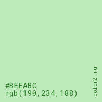 Цвет #BEEABC в цветовой модели RGB обозначается тремя октетами (190, 234, 188) в десятичном формате и #BEEABC в шестнадцатиричном (hex) формате, которые являются интенсивностью красного 190 (hex BE), интенсивность зелёного 234 (hex EA) и интенсивность синего 188 (hex BC).