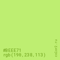 Цвет #BEEE71 в цветовой модели RGB обозначается тремя октетами (190, 238, 113) в десятичном формате и #BEEE71 в шестнадцатиричном (hex) формате, которые являются интенсивностью красного 190 (hex BE), интенсивность зелёного 238 (hex EE) и интенсивность синего 113 (hex 71).