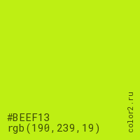 Цвет #BEEF13 в цветовой модели RGB обозначается тремя октетами (190, 239, 19) в десятичном формате и #BEEF13 в шестнадцатиричном (hex) формате, которые являются интенсивностью красного 190 (hex BE), интенсивность зелёного 239 (hex EF) и интенсивность синего 19 (hex 13).