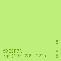 Цвет #BEEF7A в цветовой модели RGB обозначается тремя октетами (190, 239, 122) в десятичном формате и #BEEF7A в шестнадцатиричном (hex) формате, которые являются интенсивностью красного 190 (hex BE), интенсивность зелёного 239 (hex EF) и интенсивность синего 122 (hex 7A).