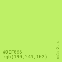 Цвет #BEF066 в цветовой модели RGB обозначается тремя октетами (190, 240, 102) в десятичном формате и #BEF066 в шестнадцатиричном (hex) формате, которые являются интенсивностью красного 190 (hex BE), интенсивность зелёного 240 (hex F0) и интенсивность синего 102 (hex 66).