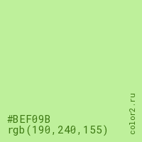 Цвет #BEF09B в цветовой модели RGB обозначается тремя октетами (190, 240, 155) в десятичном формате и #BEF09B в шестнадцатиричном (hex) формате, которые являются интенсивностью красного 190 (hex BE), интенсивность зелёного 240 (hex F0) и интенсивность синего 155 (hex 9B).