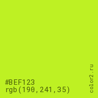 Цвет #BEF123 в цветовой модели RGB обозначается тремя октетами (190, 241, 35) в десятичном формате и #BEF123 в шестнадцатиричном (hex) формате, которые являются интенсивностью красного 190 (hex BE), интенсивность зелёного 241 (hex F1) и интенсивность синего 35 (hex 23).