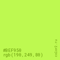 Цвет #BEF950 в цветовой модели RGB обозначается тремя октетами (190, 249, 80) в десятичном формате и #BEF950 в шестнадцатиричном (hex) формате, которые являются интенсивностью красного 190 (hex BE), интенсивность зелёного 249 (hex F9) и интенсивность синего 80 (hex 50).