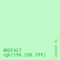 Цвет #BEFAC7 в цветовой модели RGB обозначается тремя октетами (190, 250, 199) в десятичном формате и #BEFAC7 в шестнадцатиричном (hex) формате, которые являются интенсивностью красного 190 (hex BE), интенсивность зелёного 250 (hex FA) и интенсивность синего 199 (hex C7).