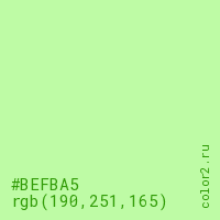 Цвет #BEFBA5 в цветовой модели RGB обозначается тремя октетами (190, 251, 165) в десятичном формате и #BEFBA5 в шестнадцатиричном (hex) формате, которые являются интенсивностью красного 190 (hex BE), интенсивность зелёного 251 (hex FB) и интенсивность синего 165 (hex A5).