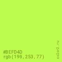 Цвет #BEFD4D в цветовой модели RGB обозначается тремя октетами (190, 253, 77) в десятичном формате и #BEFD4D в шестнадцатиричном (hex) формате, которые являются интенсивностью красного 190 (hex BE), интенсивность зелёного 253 (hex FD) и интенсивность синего 77 (hex 4D).