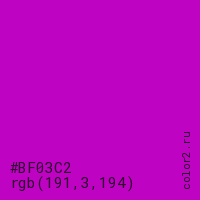 Цвет #BF03C2 в цветовой модели RGB обозначается тремя октетами (191, 3, 194) в десятичном формате и #BF03C2 в шестнадцатиричном (hex) формате, которые являются интенсивностью красного 191 (hex BF), интенсивность зелёного 3 (hex 03) и интенсивность синего 194 (hex C2).