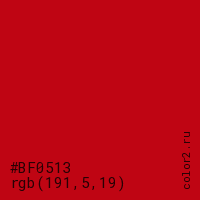 Цвет #BF0513 в цветовой модели RGB обозначается тремя октетами (191, 5, 19) в десятичном формате и #BF0513 в шестнадцатиричном (hex) формате, которые являются интенсивностью красного 191 (hex BF), интенсивность зелёного 5 (hex 05) и интенсивность синего 19 (hex 13).