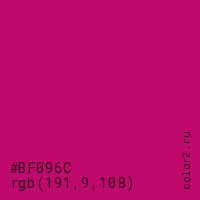 Цвет #BF096C в цветовой модели RGB обозначается тремя октетами (191, 9, 108) в десятичном формате и #BF096C в шестнадцатиричном (hex) формате, которые являются интенсивностью красного 191 (hex BF), интенсивность зелёного 9 (hex 09) и интенсивность синего 108 (hex 6C).