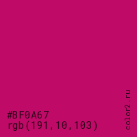 Цвет #BF0A67 в цветовой модели RGB обозначается тремя октетами (191, 10, 103) в десятичном формате и #BF0A67 в шестнадцатиричном (hex) формате, которые являются интенсивностью красного 191 (hex BF), интенсивность зелёного 10 (hex 0A) и интенсивность синего 103 (hex 67).