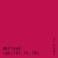 Цвет #BF104E в цветовой модели RGB обозначается тремя октетами (191, 16, 78) в десятичном формате и #BF104E в шестнадцатиричном (hex) формате, которые являются интенсивностью красного 191 (hex BF), интенсивность зелёного 16 (hex 10) и интенсивность синего 78 (hex 4E).