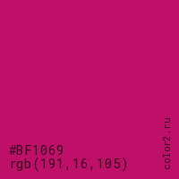 Цвет #BF1069 в цветовой модели RGB обозначается тремя октетами (191, 16, 105) в десятичном формате и #BF1069 в шестнадцатиричном (hex) формате, которые являются интенсивностью красного 191 (hex BF), интенсивность зелёного 16 (hex 10) и интенсивность синего 105 (hex 69).