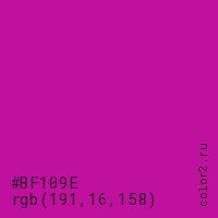 Цвет #BF109E в цветовой модели RGB обозначается тремя октетами (191, 16, 158) в десятичном формате и #BF109E в шестнадцатиричном (hex) формате, которые являются интенсивностью красного 191 (hex BF), интенсивность зелёного 16 (hex 10) и интенсивность синего 158 (hex 9E).