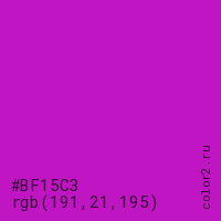 Цвет #BF15C3 в цветовой модели RGB обозначается тремя октетами (191, 21, 195) в десятичном формате и #BF15C3 в шестнадцатиричном (hex) формате, которые являются интенсивностью красного 191 (hex BF), интенсивность зелёного 21 (hex 15) и интенсивность синего 195 (hex C3).