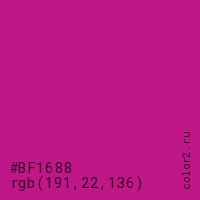 Цвет #BF1688 в цветовой модели RGB обозначается тремя октетами (191, 22, 136) в десятичном формате и #BF1688 в шестнадцатиричном (hex) формате, которые являются интенсивностью красного 191 (hex BF), интенсивность зелёного 22 (hex 16) и интенсивность синего 136 (hex 88).