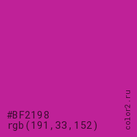 Цвет #BF2198 в цветовой модели RGB обозначается тремя октетами (191, 33, 152) в десятичном формате и #BF2198 в шестнадцатиричном (hex) формате, которые являются интенсивностью красного 191 (hex BF), интенсивность зелёного 33 (hex 21) и интенсивность синего 152 (hex 98).