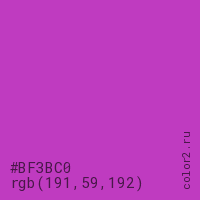 Цвет #BF3BC0 в цветовой модели RGB обозначается тремя октетами (191, 59, 192) в десятичном формате и #BF3BC0 в шестнадцатиричном (hex) формате, которые являются интенсивностью красного 191 (hex BF), интенсивность зелёного 59 (hex 3B) и интенсивность синего 192 (hex C0).