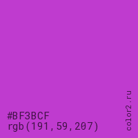 Цвет #BF3BCF в цветовой модели RGB обозначается тремя октетами (191, 59, 207) в десятичном формате и #BF3BCF в шестнадцатиричном (hex) формате, которые являются интенсивностью красного 191 (hex BF), интенсивность зелёного 59 (hex 3B) и интенсивность синего 207 (hex CF).