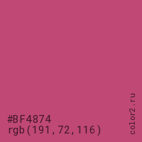 Цвет #BF4874 в цветовой модели RGB обозначается тремя октетами (191, 72, 116) в десятичном формате и #BF4874 в шестнадцатиричном (hex) формате, которые являются интенсивностью красного 191 (hex BF), интенсивность зелёного 72 (hex 48) и интенсивность синего 116 (hex 74).