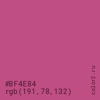 Цвет #BF4E84 в цветовой модели RGB обозначается тремя октетами (191, 78, 132) в десятичном формате и #BF4E84 в шестнадцатиричном (hex) формате, которые являются интенсивностью красного 191 (hex BF), интенсивность зелёного 78 (hex 4E) и интенсивность синего 132 (hex 84).