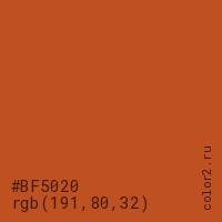 Цвет #BF5020 в цветовой модели RGB обозначается тремя октетами (191, 80, 32) в десятичном формате и #BF5020 в шестнадцатиричном (hex) формате, которые являются интенсивностью красного 191 (hex BF), интенсивность зелёного 80 (hex 50) и интенсивность синего 32 (hex 20).