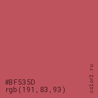 Цвет #BF535D в цветовой модели RGB обозначается тремя октетами (191, 83, 93) в десятичном формате и #BF535D в шестнадцатиричном (hex) формате, которые являются интенсивностью красного 191 (hex BF), интенсивность зелёного 83 (hex 53) и интенсивность синего 93 (hex 5D).