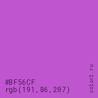 Цвет #BF56CF в цветовой модели RGB обозначается тремя октетами (191, 86, 207) в десятичном формате и #BF56CF в шестнадцатиричном (hex) формате, которые являются интенсивностью красного 191 (hex BF), интенсивность зелёного 86 (hex 56) и интенсивность синего 207 (hex CF).